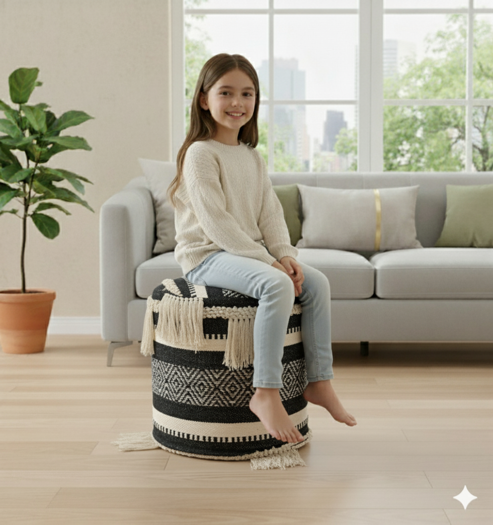 This cotton pouf is a versatile and stylish addition to any living space. Made from soft, durable cotton, it provides comfort and functionality, serving as a stool, footrest, or side table. Its natural texture and handcrafted appeal make it perfect for adding a cozy, artisanal touch to living rooms, bedrooms, or lounge areas.