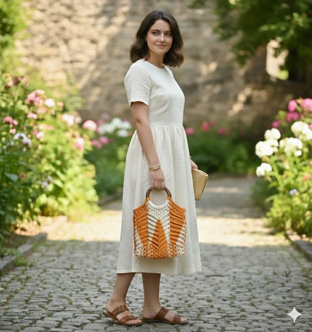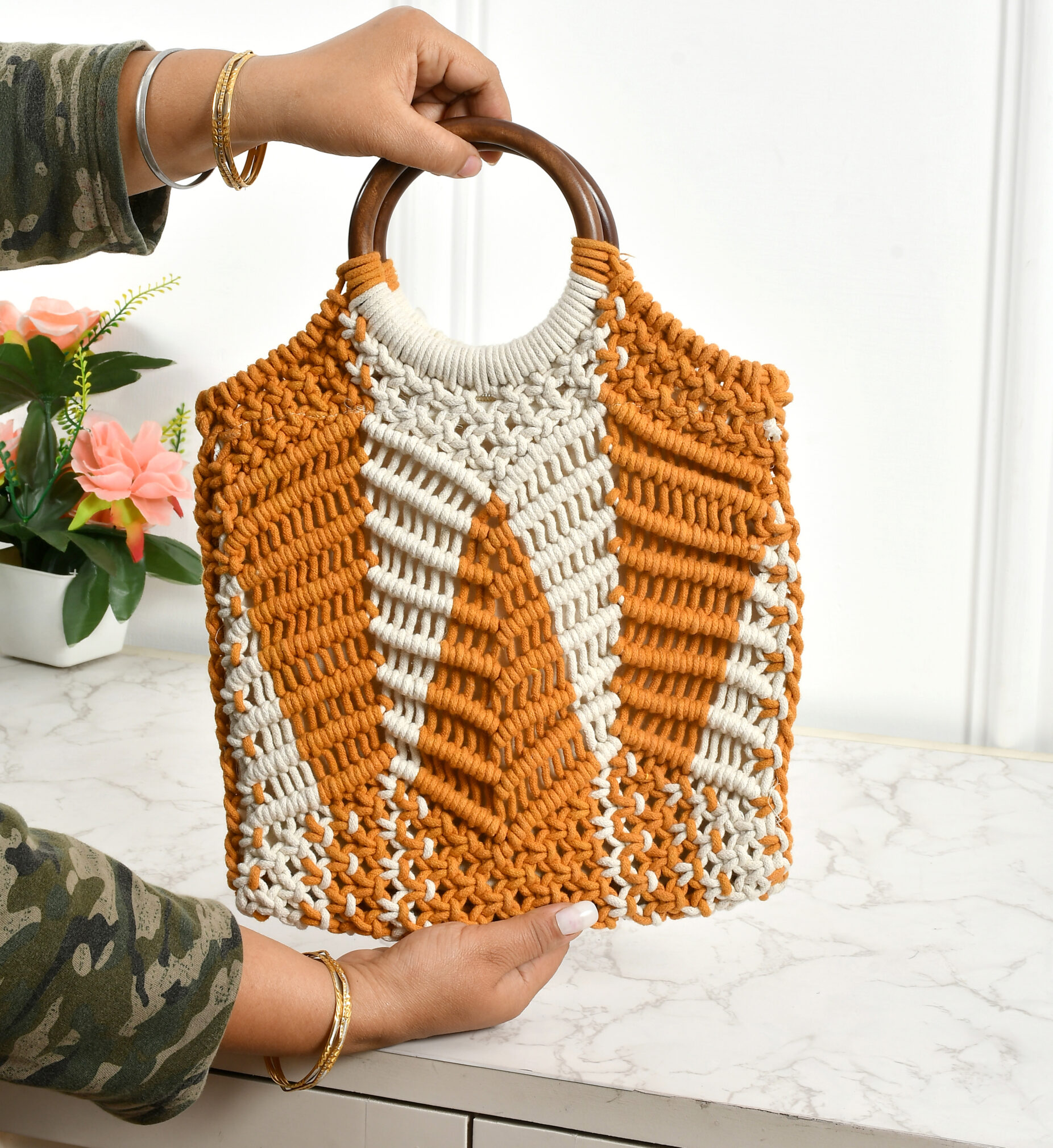 This beautiful handbag for women is handcrafted from high-quality macrame, featuring intricate knot patterns that make it both stylish and durable. The lightweight material ensures comfort, while the sturdy construction makes it perfect for everyday use. With a spacious interior, this handbag offers plenty of room to carry your essentials such as your phone, wallet, and cosmetics. Its unique design and boho-chic charm make it a versatile accessory that complements various outfits, from casual to semi-formal. Made from eco-friendly materials, this macrame handbag is the perfect blend of fashion, function, and sustainability for the modern, conscious woman.