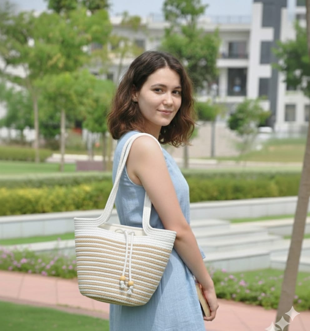 Our cotton and jute braided bag offers a stylish, eco-friendly solution for carrying your essentials with ease and charm.