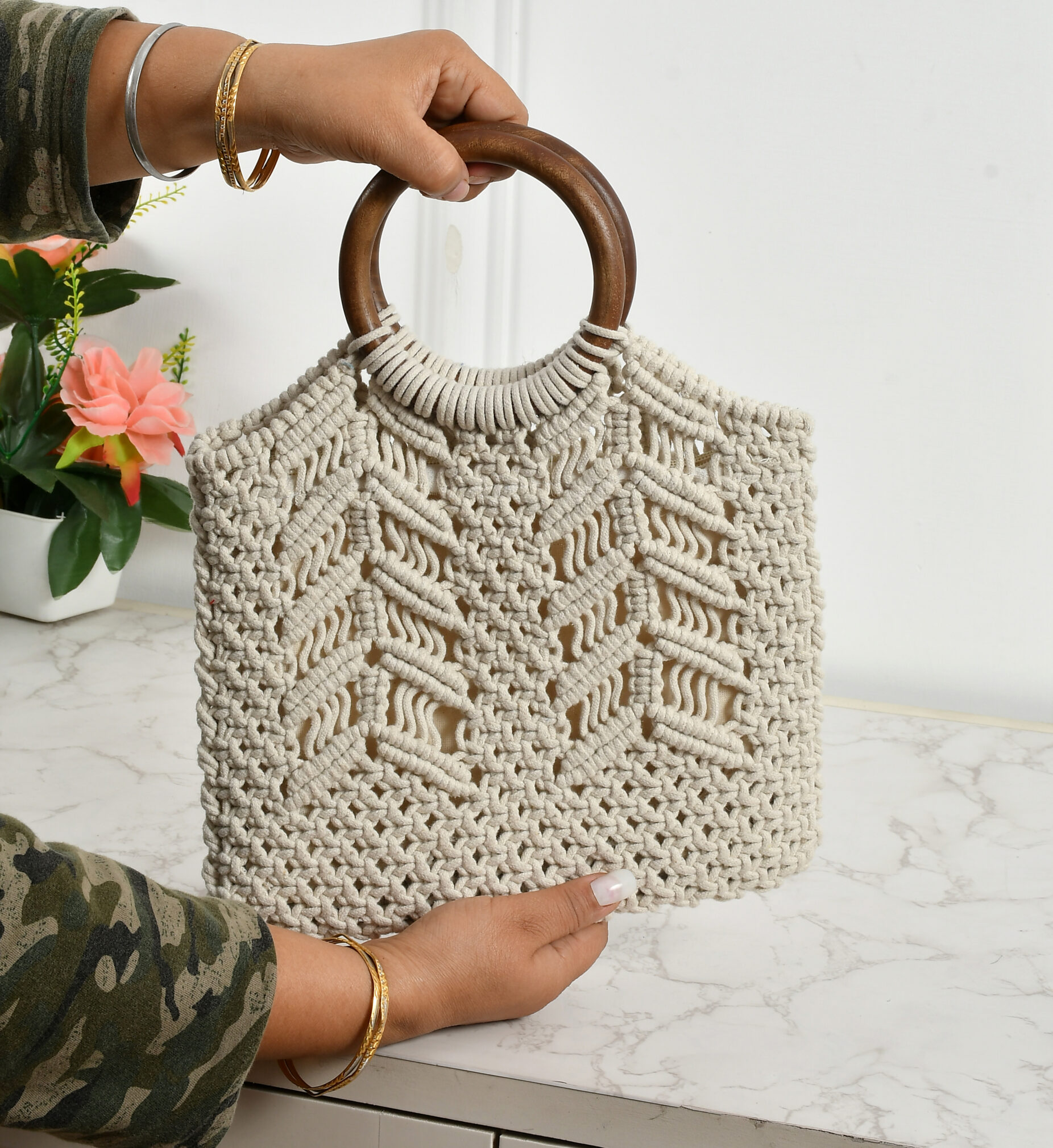 This beautiful handbag for women is handcrafted from high-quality macrame, featuring intricate knot patterns that make it both stylish and durable. The lightweight material ensures comfort, while the sturdy construction makes it perfect for everyday use. With a spacious interior, this handbag offers plenty of room to carry your essentials such as your phone, wallet, and cosmetics. Its unique design and boho-chic charm make it a versatile accessory that complements various outfits, from casual to semi-formal. Made from eco-friendly materials, this macrame handbag is the perfect blend of fashion, function, and sustainability for the modern, conscious woman.
